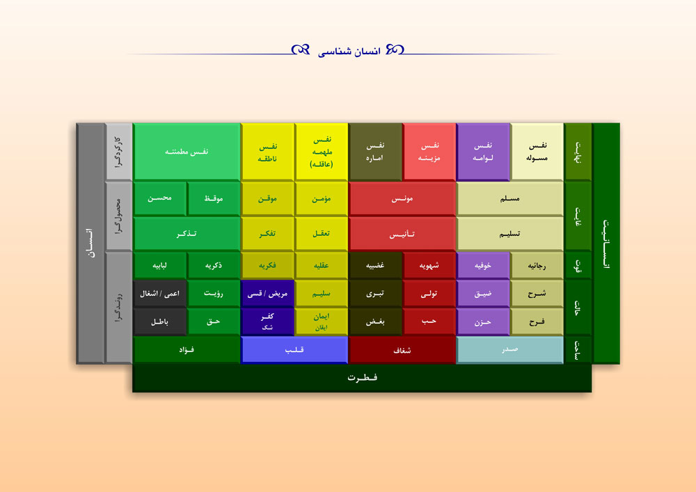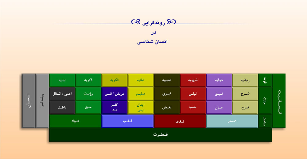 ساحت انسان در قرآن، به چهار بخش تفکیک میشود؛ صدر، شغاف، قلب و فؤاد. در واقع ساحت معنوی انسان همچون پیازی با چهار لایهی صدر و شغاف و قلب و فؤاد است. (نمودار شماره 1)